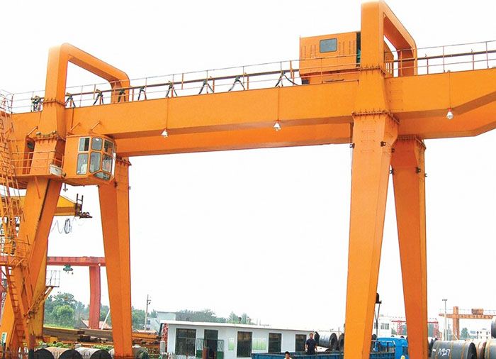 它的金属结构像门形框架,承载主梁下安装两条支脚,可以直接在地面的轨道上行走,主梁两端可以具有外伸悬臂梁。