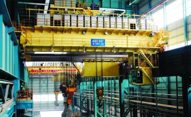 铸造桥式起重机是钢厂冶炼车间的主要起重运输设备,用于冶炼过程中液态金属的转运、浇注及兑铁水等作业。125t以下一般为YZ型双梁结构。125t以上一般为YZS型四梁结构。YZS型采用主副双小车、四梁四轨结构,主要由桥架、主小车、副小车、吊钩梁、大车运行及电气部分组成,主小车在桥架外侧的主梁轨道上运行,副小车在桥架内侧的副梁轨道上运行,主小车取物装置为固定间距的吊钩梁。