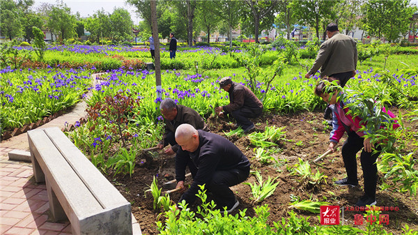 北谢村村民们来到村游园内种植绿植。