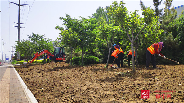 当记者一行来到周村区新华大道绿化提升改造工程项目现场时看到,园林工人们正在路边绿道内加紧栽种苗木。今年以来,周村区根据《2021年周村区全域公园城市建设行动方案》及主干道路绿化提升、施工绿化恢复和裸露绿地整治要求,实施了新华大道绿化提升改造工程。