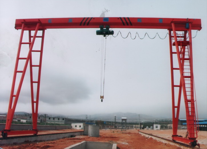 “门式起重机桥式起重机的一种变形,又叫龙门吊。主要用于室外的货场、料场货、散货的装卸作业。门式起重机具有场地利用率高、作业范围大、适应面广、通用性强等特点,在港口货场得到广泛使用。它的金属结构像门形框架,承载主梁下安装两条支脚,可以直接在地面的轨道上行走,主梁两端可以具有外伸悬臂梁。”